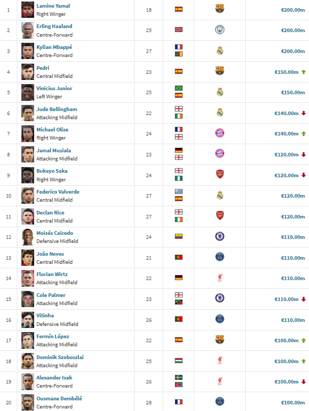 足坛20位亿元先生:亚哈姆仍2亿 英超8人西甲7人 德甲2人意甲0人