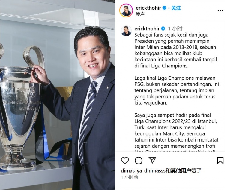托希尔:深爱的国米再次进欧冠决赛让我骄傲,希望今年能书写历史