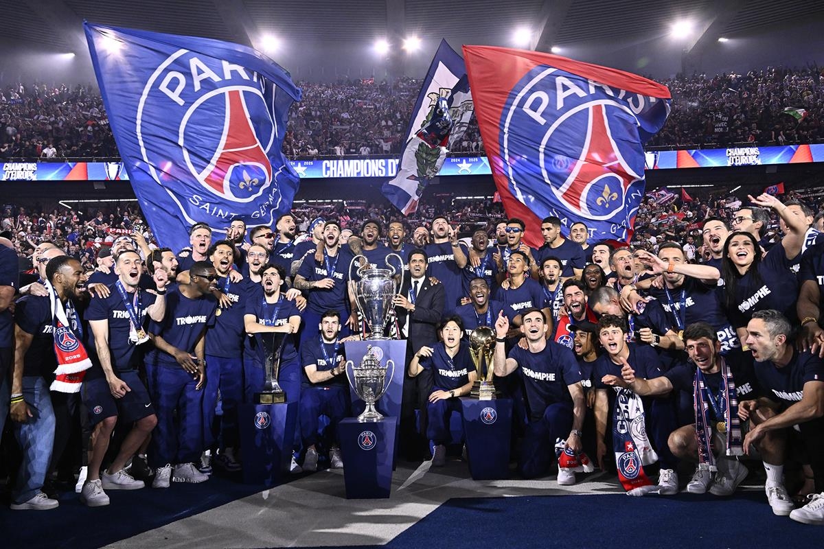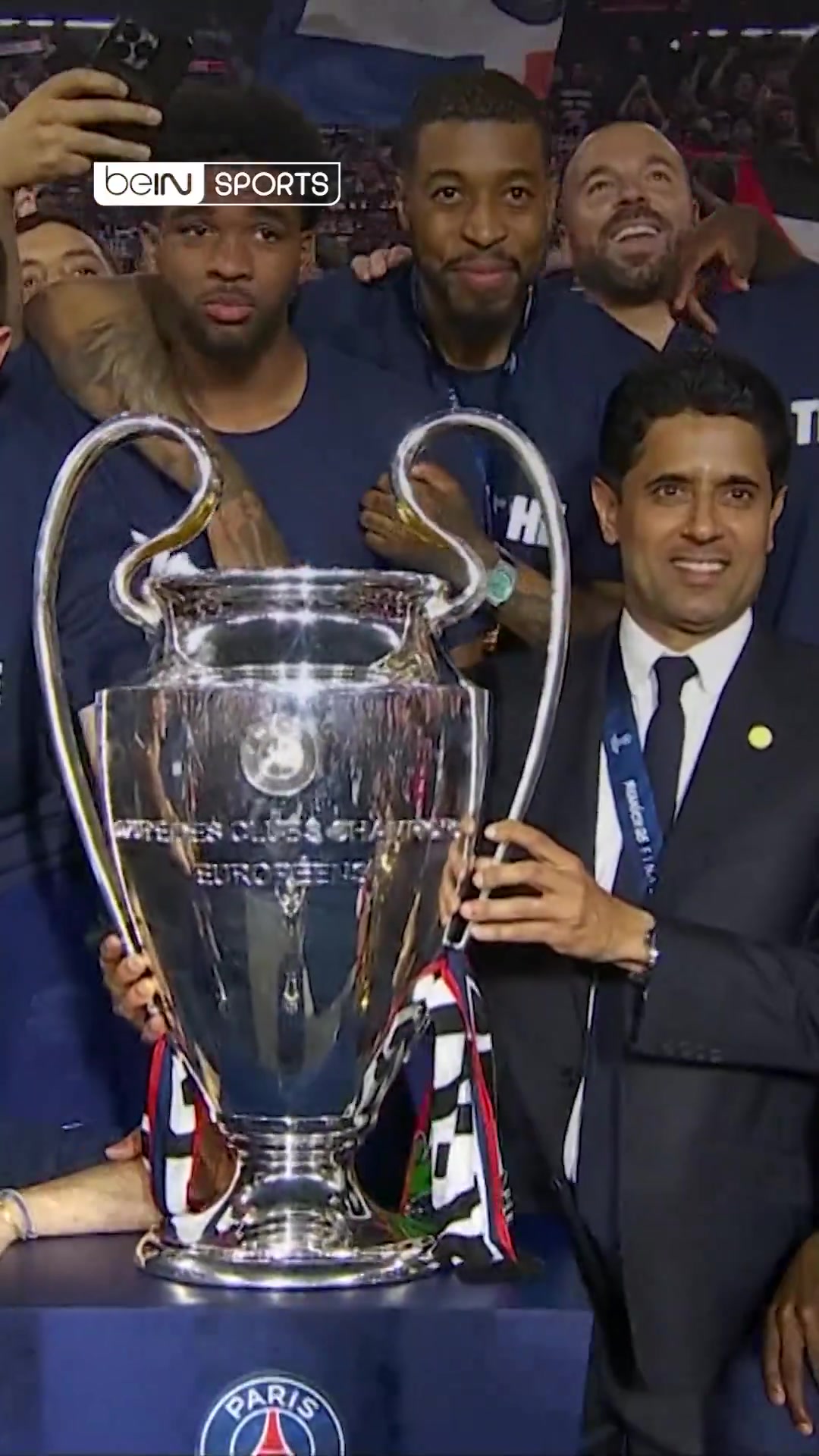 巴黎主场展示4冠&全队唱跳庆祝,纳赛尔手扶大耳朵杯爱不释手