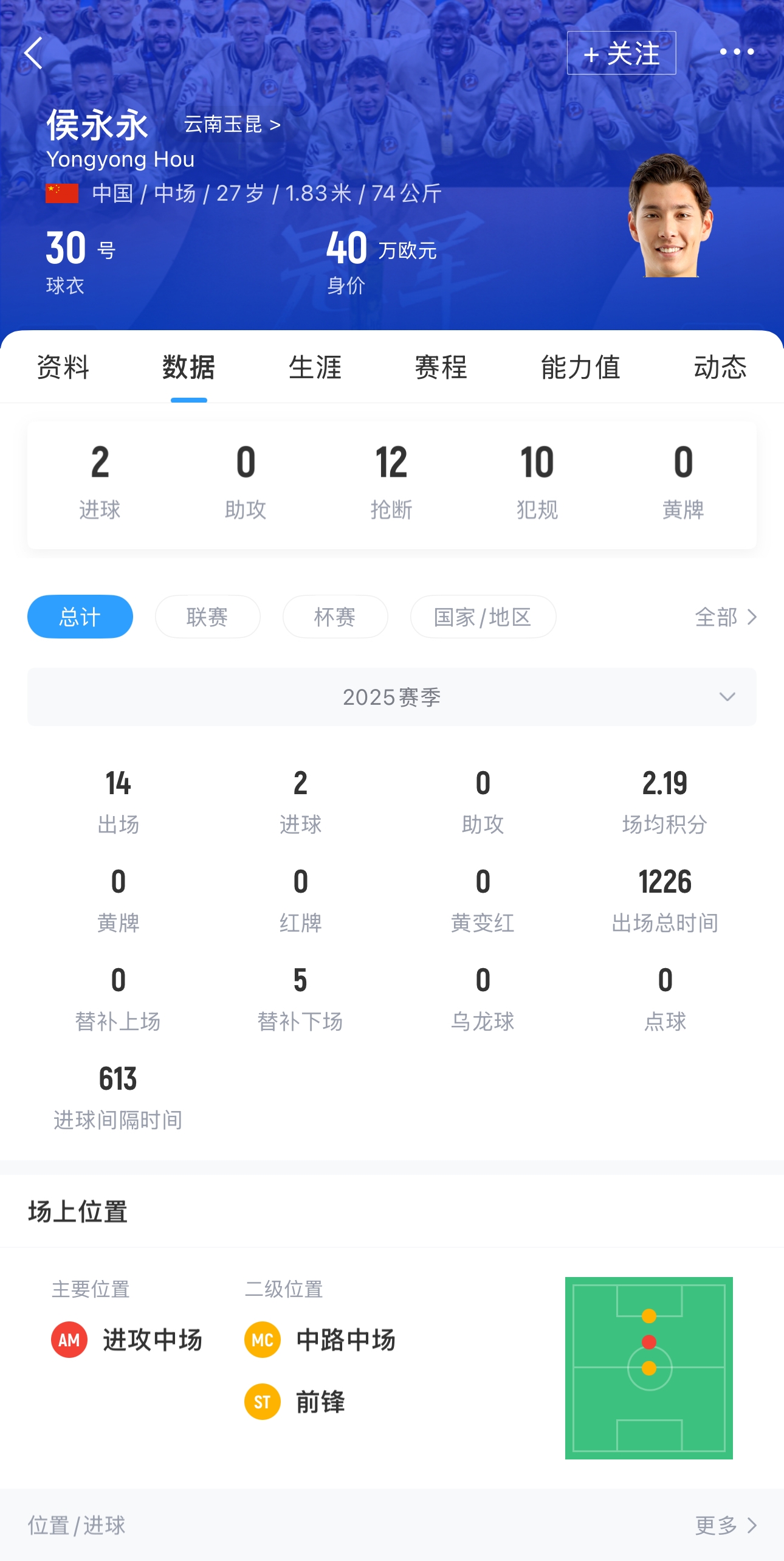 侯永永本赛季在云南玉昆各项赛事出场14次,打入2球。