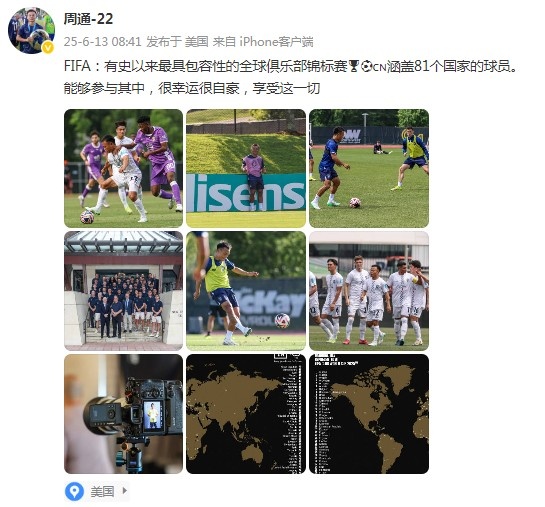 6月13日讯 即将代表奥克兰城参加世俱杯的周通,在社媒发文谈到了自己的感受。