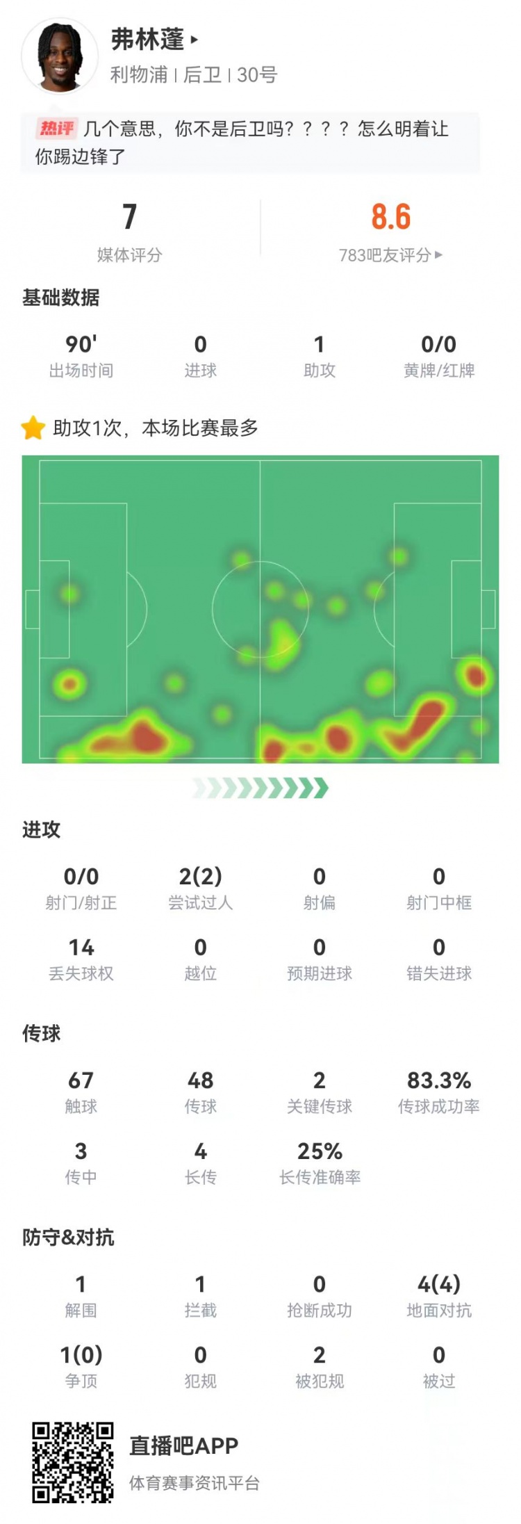 12月28日讯 利物浦在本轮英超对阵狼队,弗林蓬本场数据如下: